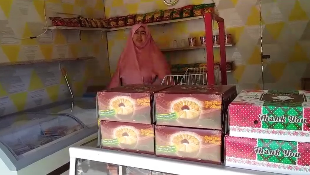 Di sekitar mereka, terdapat rak besi dengan berbagai kebutuhan pokok, mulai dari sembako hingga barang kemasan yang sudah dipaketkan. Di lantai, terlihat tumpukan produk siap distribusi, timbangan, serta sejumlah peralatan penunjang lainnya.