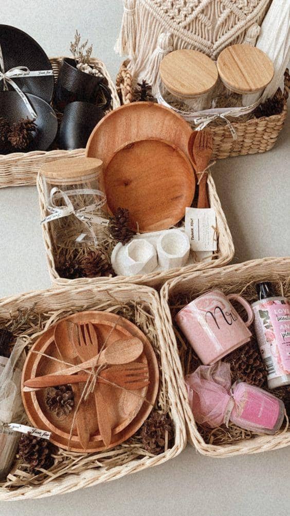 Barang pecah belah atau peralatan dapur bisa menjadi pilihan unik untuk parcel. Meskipun tidak biasa, parcel ini sangat berguna karena kebutuhan akan peralatan rumah tangga pasti dimiliki oleh semua orang. Kamu bisa memilih set piring, mangkuk, mug, serta sendok dan garpu untuk tampilan yang lebih estetis.