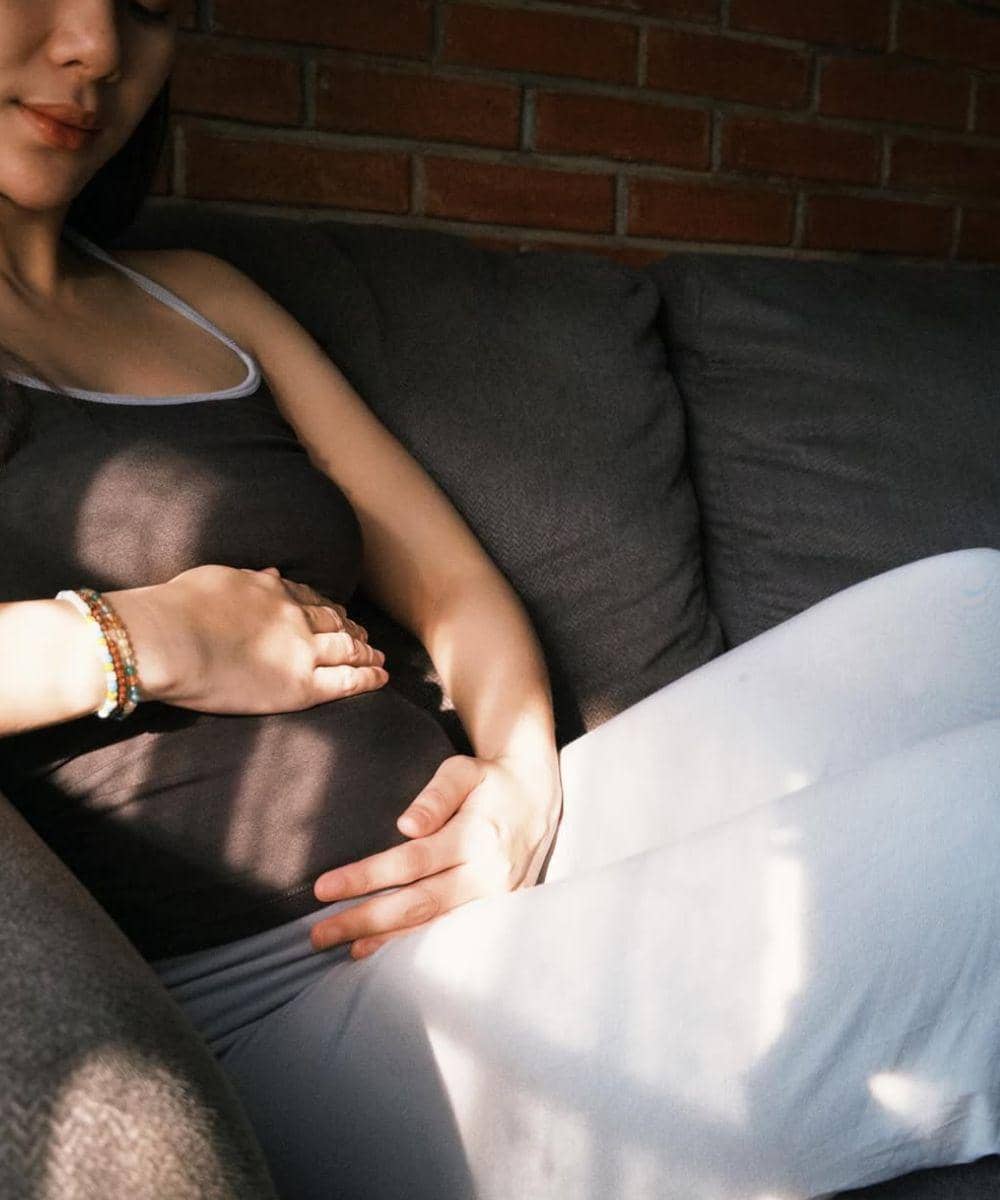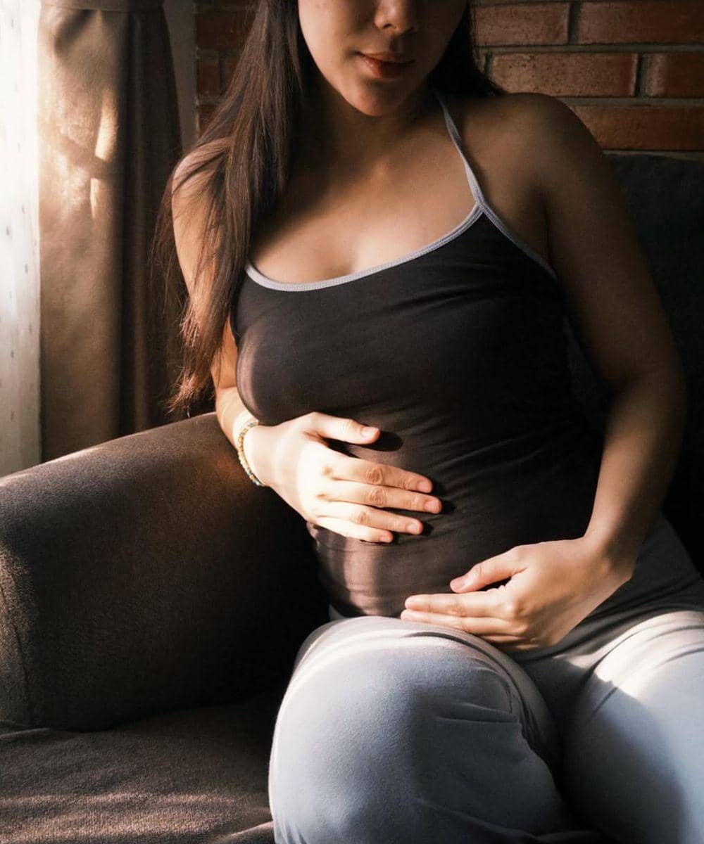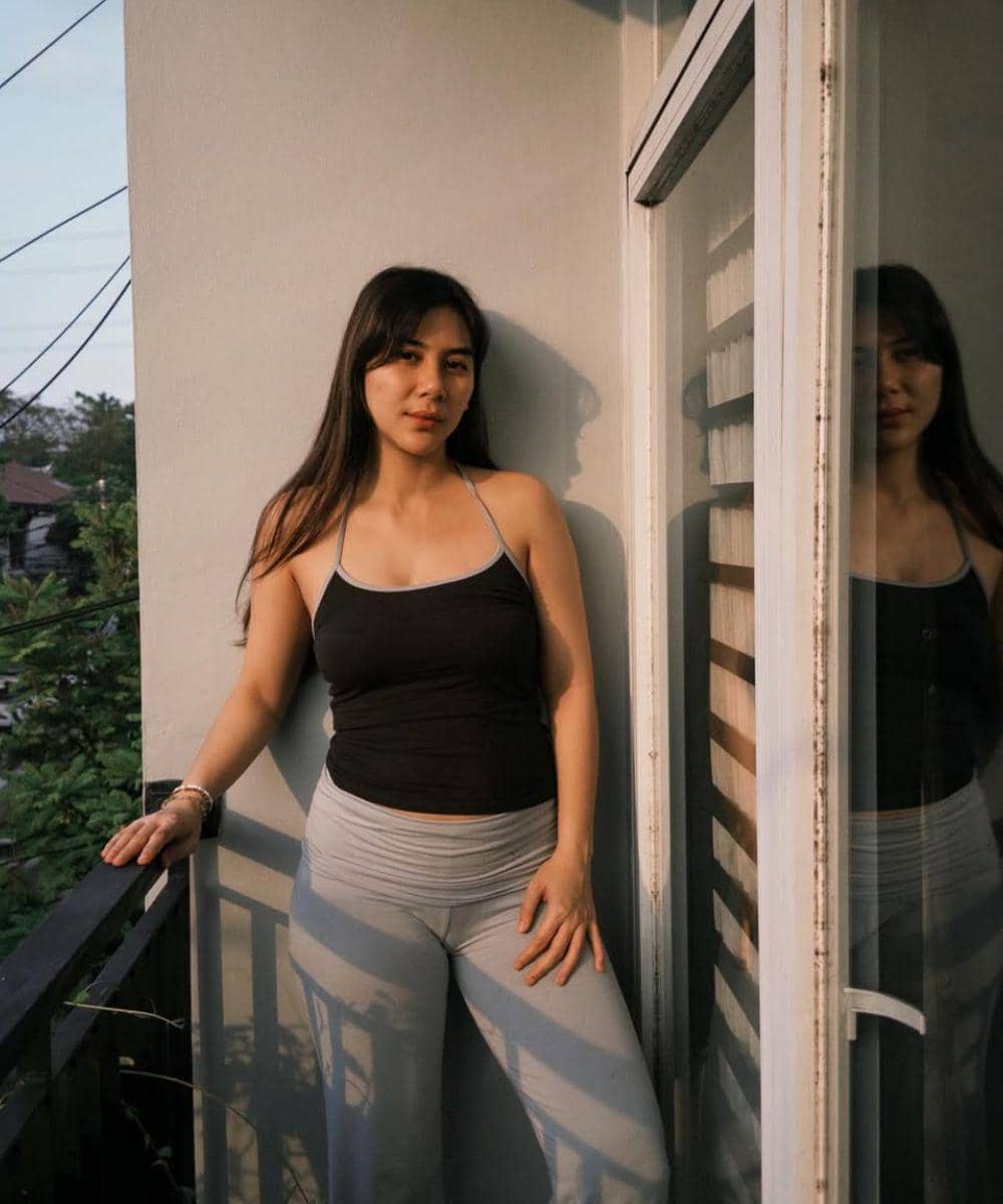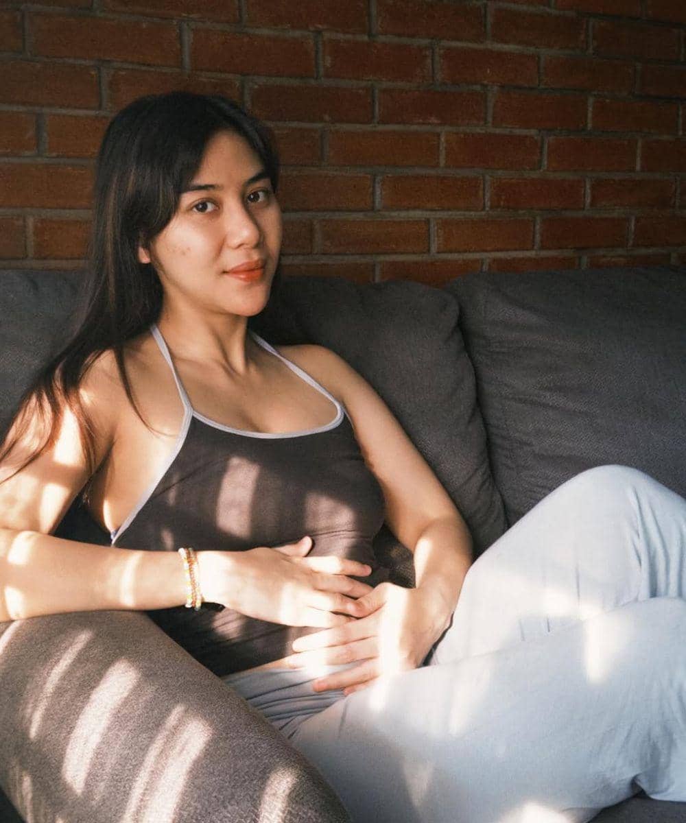 Dalam foto baby bump yang dibagikan, Adinda tampil santai dengan mengenakan tank top hitam beraksen abu-abu yang dipadukan dengan celana abu-abu. Dalam potret tersebut, Dinda duduk di sofa abu-abu gelap dengan latar dinding bata merah yang memberi kesan hangat.