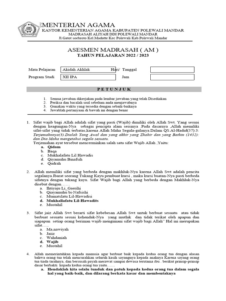 Asesmen Madrasah 2026 menekankan pentingnya pemahaman mendalam tentang akidah dan akhlak sebagai fondasi keimanan siswa. Simulasi 20 soal Akidah Akhlak kelas 12 ini dirancang sesuai kisi-kisi terbaru untuk melatih analisis dan penerapan nilai-nilai Islam. Latihan ini membantu guru dan siswa mengevaluasi penguasaan materi secara efektif menjelang ujian.