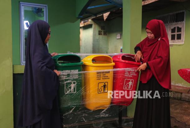 Warga merakit tempat sampah baru yang disalurkan unthk mushola pada kegiatan ini. – (/Thoudy Badai)