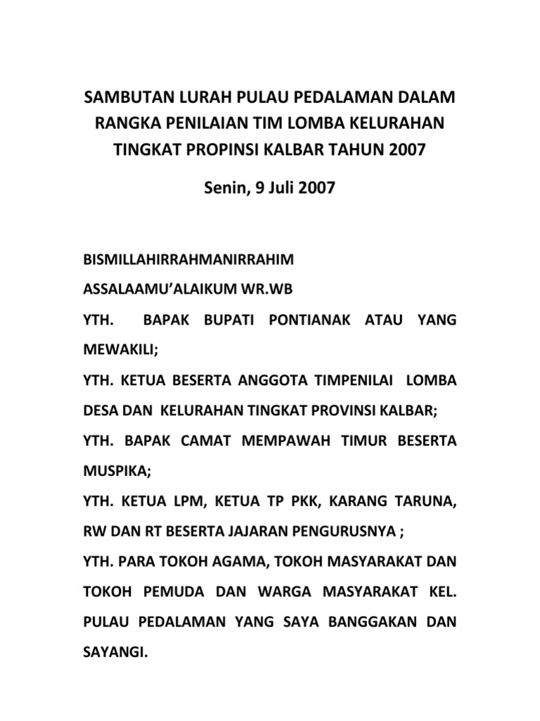 “Pada kesempatan yang baik ini, saya selaku Lurah Pulau Pedalaman menyampaikan ucapan terima kasih dan apresiasi yang setinggi-tingginya kepada para insan seni dan budayawan yang telah mempercayai Kelurahan Pulau Pedalaman sebagai ruang dan tempat untuk beraktivitas, berkarya, serta mengekspresikan nilai-nilai seni dan budaya.”